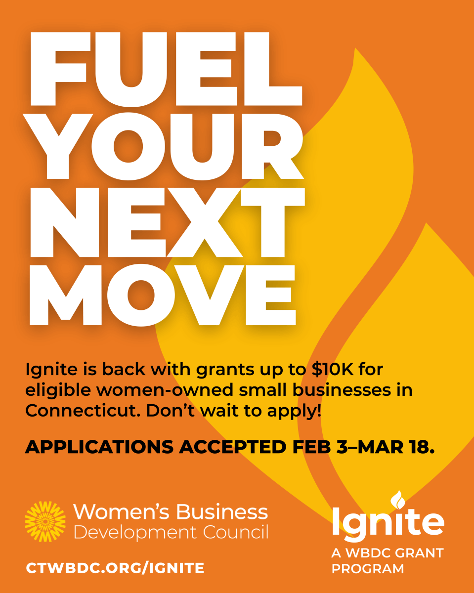 Women's Business Development Council's Ignite program offers cash grants ranging from $2,500 to $10,000 to qualified women-owned small businesses in Connecticut for clearly-defined projects that will have a measurable impact on the business, its growth, and profitability.